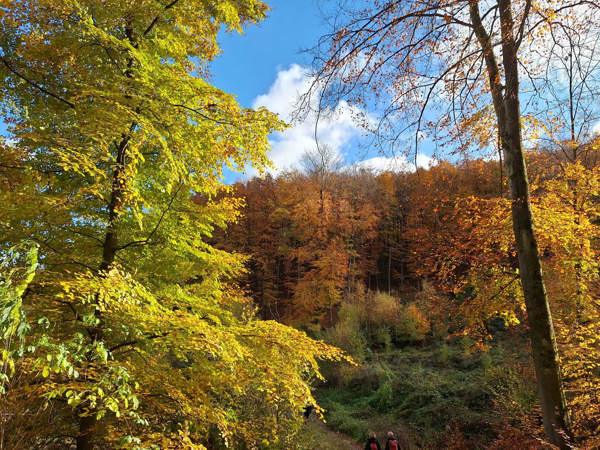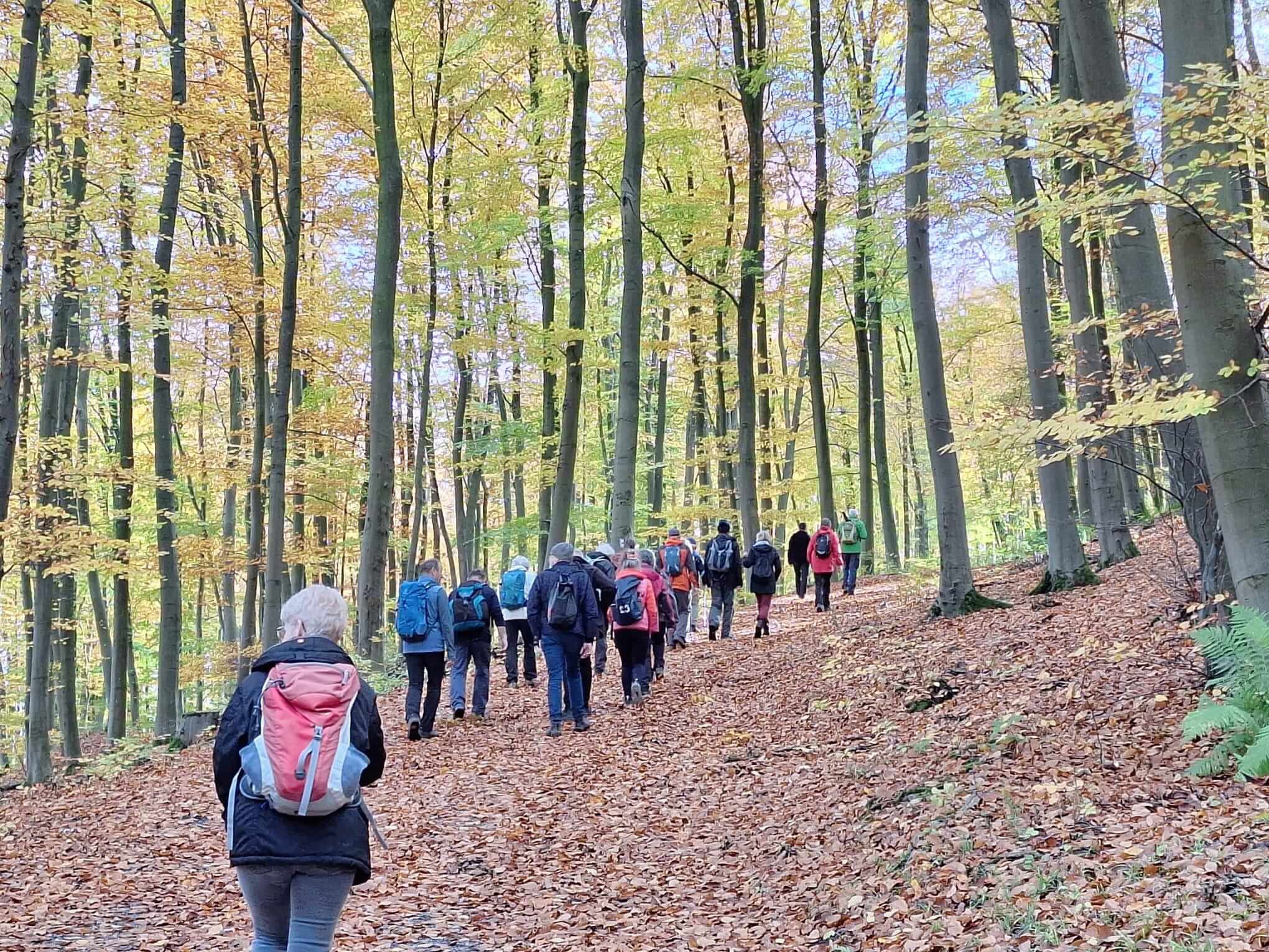 Gleich zum Start im Stephanopeler Tal gab der Wanderführer den Rahmen für die heutige Wanderung vor. Galt es doch, drei „Berge“ mit jeweils über 500 Metern Höhe „zu erklimmen“. Ausgestattet mit diesem Wissen, stiegen die Teilnehmenden dann auf, zunächst auf den mit 546 Metern höchsten Punkt der Wanderung, auf die „Anhöhe Balver Wald“. Zwischenzeitlich war auch die Sonne spärlich hervorgetreten und sorgte für ein starkes Panorama mit verschiedenen Blautönen, die in unterschiedlichste Wolkenformationen eingehüllt waren und mit fantastischen Fernsichten. Der Blick reichte über den bunten herbstlichen Blätterwald, aber auch über große Freiflächen bis weit ins Sauerland hinein oder nach Nordwesten z. B. weit über Dortmund hinaus. Vom ersten Teilziel ging es dann wieder bergab bis zum nächsten Aufstieg auf den „Steinradeberg“ mit 523 Metern. Hier begann es dann zu regnen und zwar mit zunehmender Intensität. Trotzdem entschieden sich die Wanderer/innen weiter zu laufen bis zum „Ostenberg“ mit 501 Metern Höhe. Nun erfolgte der Abstieg und zwar über einen Singletrail, den sich die Gruppe nunmehr mit Downhill-Fahrern teilen musste. Es galt also, mit voller Konzentration auf Matsch, Wurzeln, Steine zu achten, zum anderen aber auch aufmerksam zu sein und den vorbeibrausenden (freundlichen) Radfahrern den Vorrang einzuräumen. Gleichwohl kamen die Wanderer/innen nach fast 5 Stunden wieder unbeschadet ins Stepfanopeler Tal zurück und waren sich einig, eine wirklich schöne, aber auch herausfordernde ca. 18 km lange Wanderung erlebt zu haben.