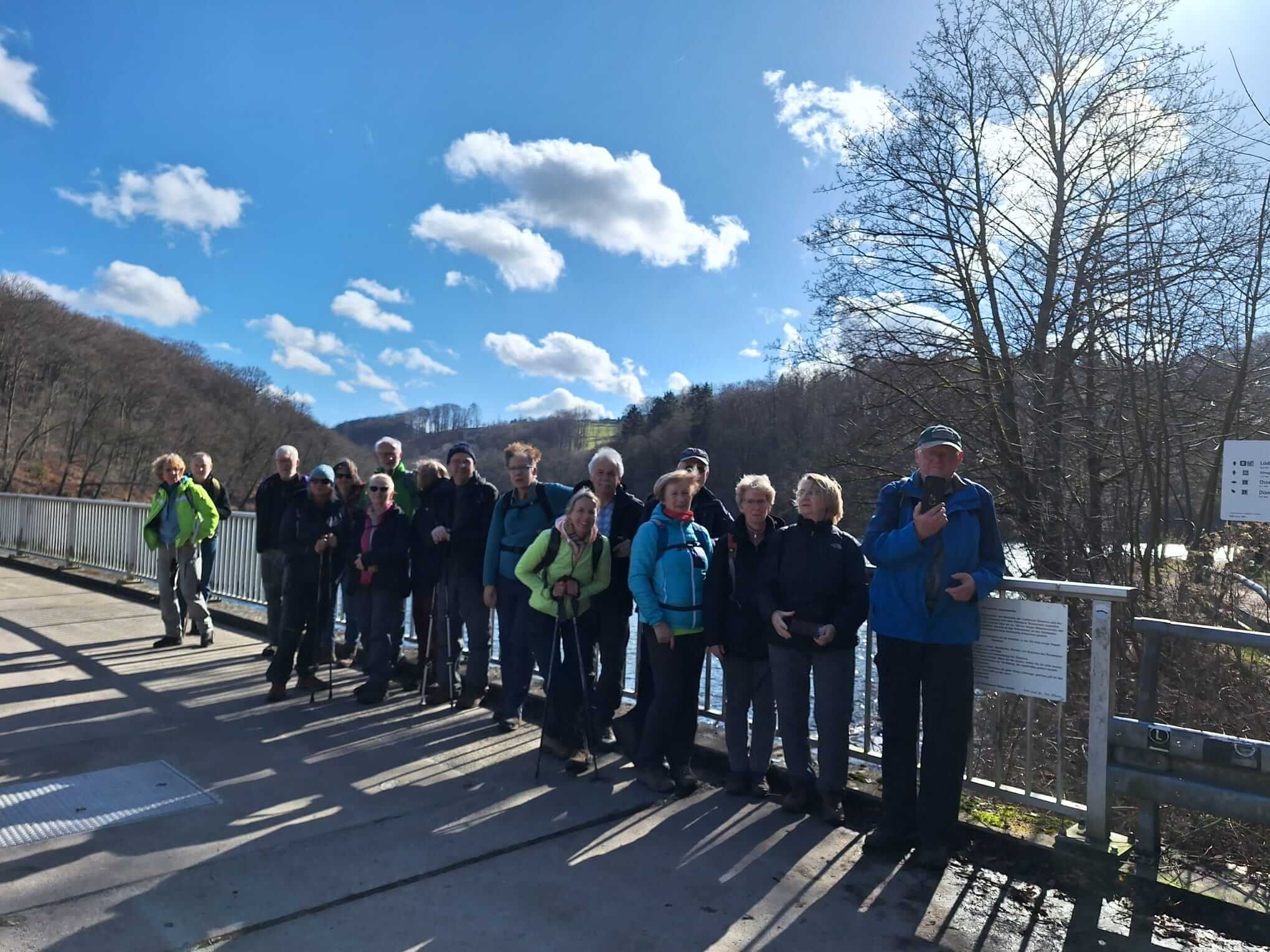 Um 8:30 Uhr sah man mit einem Blick aus dem Fenster ausschließlich „tiefgrau“. Der Regen prasselte. Das Wetter konnte daher zunächst keine Aufbruchstimmung erzeugen. Doch um 9 Uhr starteten dann trotzdem neun Wanderfreund/innen zum Möhnesee, zur ca. 14 km langen Wanderung durch den Arnsberger Wald. Vom Wanderparkplatz Torhaus aus ging es an den schönen Anlagen des Landhotels vorbei Richtung See. Weiter über einen kleinen Pfad am Ufer entlang und auf überwiegend befestigten und leicht begehbaren Wegen zum Möhnesee-Turm. Die 42 Meter hohe Aussichtsplattform, die man über 206 Treppenstufen erreichte, bot einen fantastischen Ausblick über den See, den Naturpark Arnsberger Wald sowie die umliegenden Dörfer. Auch das Wetter hatte sich zunehmend zum Guten gewendet, so dass abschließend bei Kaffee und Kuchen im SGV-Wanderheim ein rundherum positives Fazit durch die Teilnehmer/innen gezogen werden konnte.