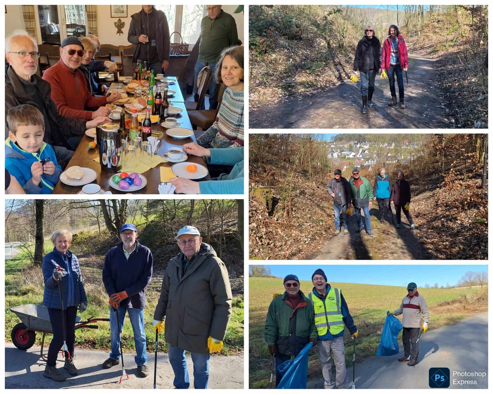 Mit Handschuhen, Müllzangen, Plastiksäcken und Schubkarren ausgestattet ging es darum, Kaffeebecher, Verpackungsreste aller Art, Flaschen, Getränkedosen, aber auch Bad-Keramik, Spiegelschrank, Dunstabzugshaube, Autoreifen, alte Gartenmöbel, ein Laminatfußboden, Bauschutt, Fliesen, eine zerstörte Kinderkletterwand, verschiedenste Hygieneartikel und große, schwere Plastiksäcke mit undefiniertem Inhalt, zu bergen und an zentraler Stelle zum Abtransport bereit zu stellen.