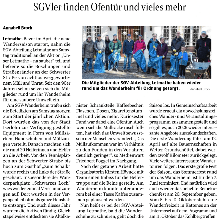 Letmathe, 25.03.2026: Der ISERLOHNER KREISANZEIGER berichtet in der heutigen Ausgabe über die Umweltaktion des SGV Letmathe